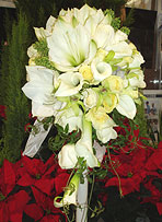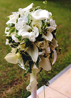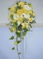 滝のように流れ落ちるスタイルのブーケ。華やかな正統派です。