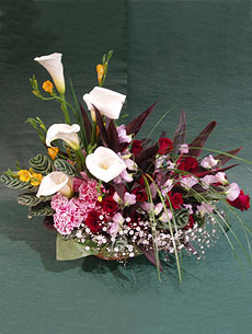 カラーをアクセントに大輪のバラ、カーネーションなどを組み合わせ、新しい旅立ちに相応しい、落ち着いた雰囲気に仕上げました。 |